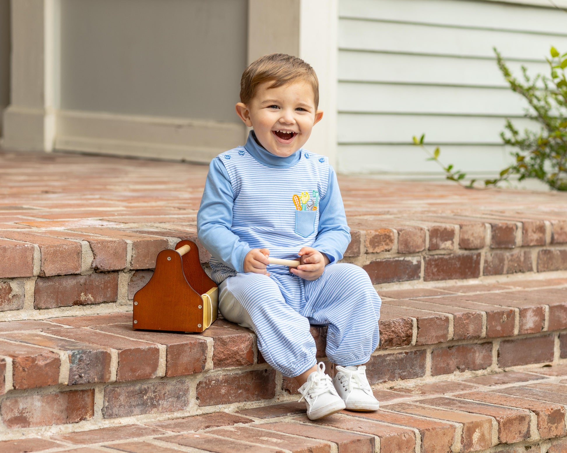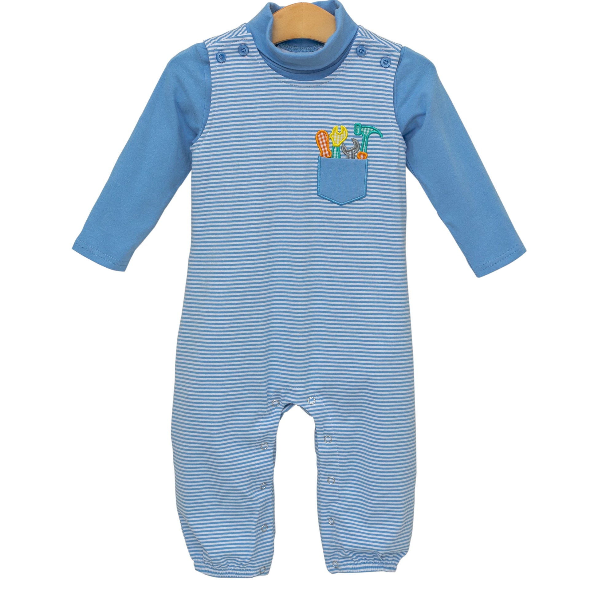 The Tools Jon Jon Set from Trotter Street Kids is a charming one-piece outfit designed for little builders with big imaginations. This romper features a blue and white striped body with solid blue sleeves and collar, creating a classic layered look. A small chest pocket showcases colorful embroidered tools and desert-themed characters, adding playful personality to the design. With snap closures at the shoulders and inseam, it’s as practical as it is adorable—perfect for busy days, photo ops, or gifting.