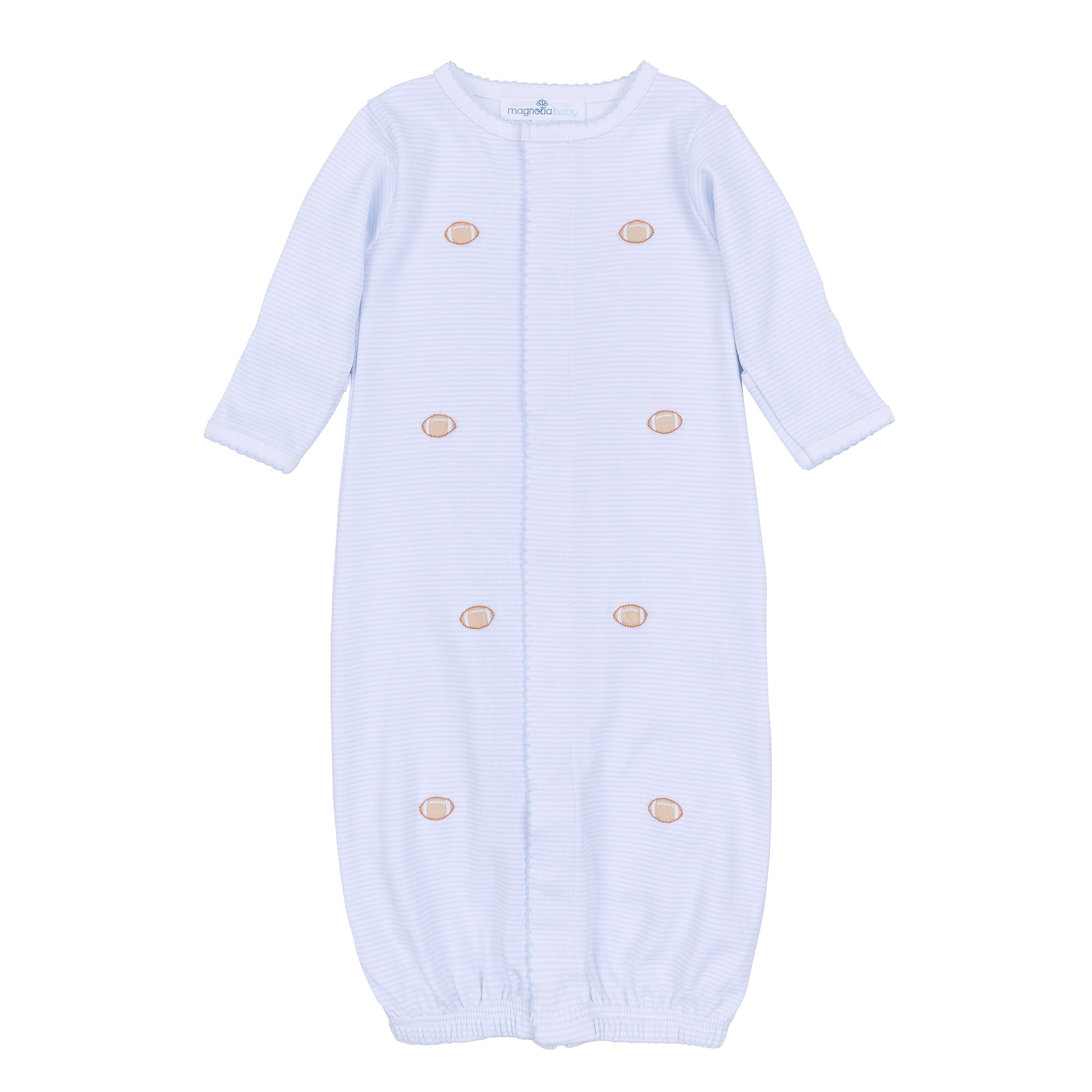 Cheer for versatility with Magnolia Baby's adorable Touchdown Cutie Embroidered Converter! Made from luxurious Pima Cotton, this adaptable light blue piece features a hand-embroidered football, effortlessly converting for play or sleep.