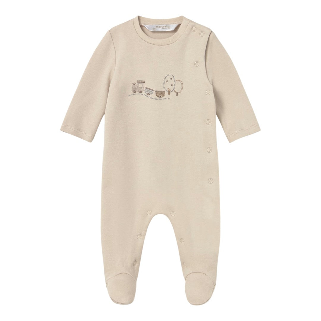 Long sleeved one-piece for newborn baby boy. Round neckline. Side fastening with press studs. Snap button fastening at crotch for easy dressing. Decorative elements: embroidery. For this item, the larger sizes (from 6-9 months to 18 months) will not have feet. This is to allow better mobility and more comfort.