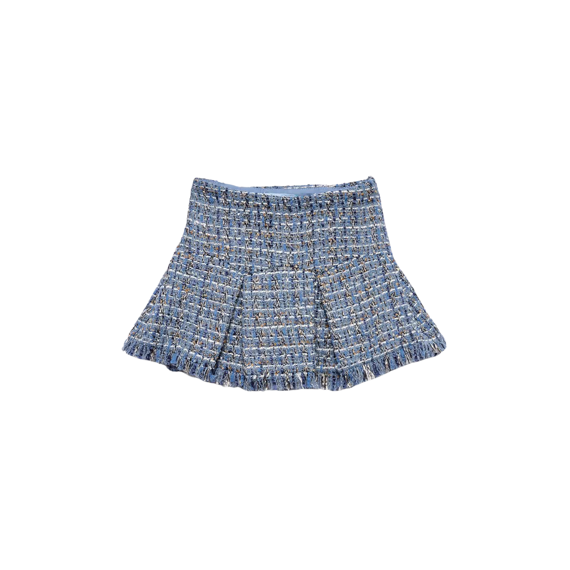 The Tweed Skirt in Sky Blue from Abel & Lula is a polished piece with a playful twist, perfect for elevating any seasonal wardrobe. Crafted in a textured tweed weave, this flared mini skirt features a soft palette of sky blue, white, and hints of gold for a refined yet youthful look. The frayed hem adds a touch of casual charm, while the structured silhouette makes it ideal for pairing with cozy knits or tailored tops.