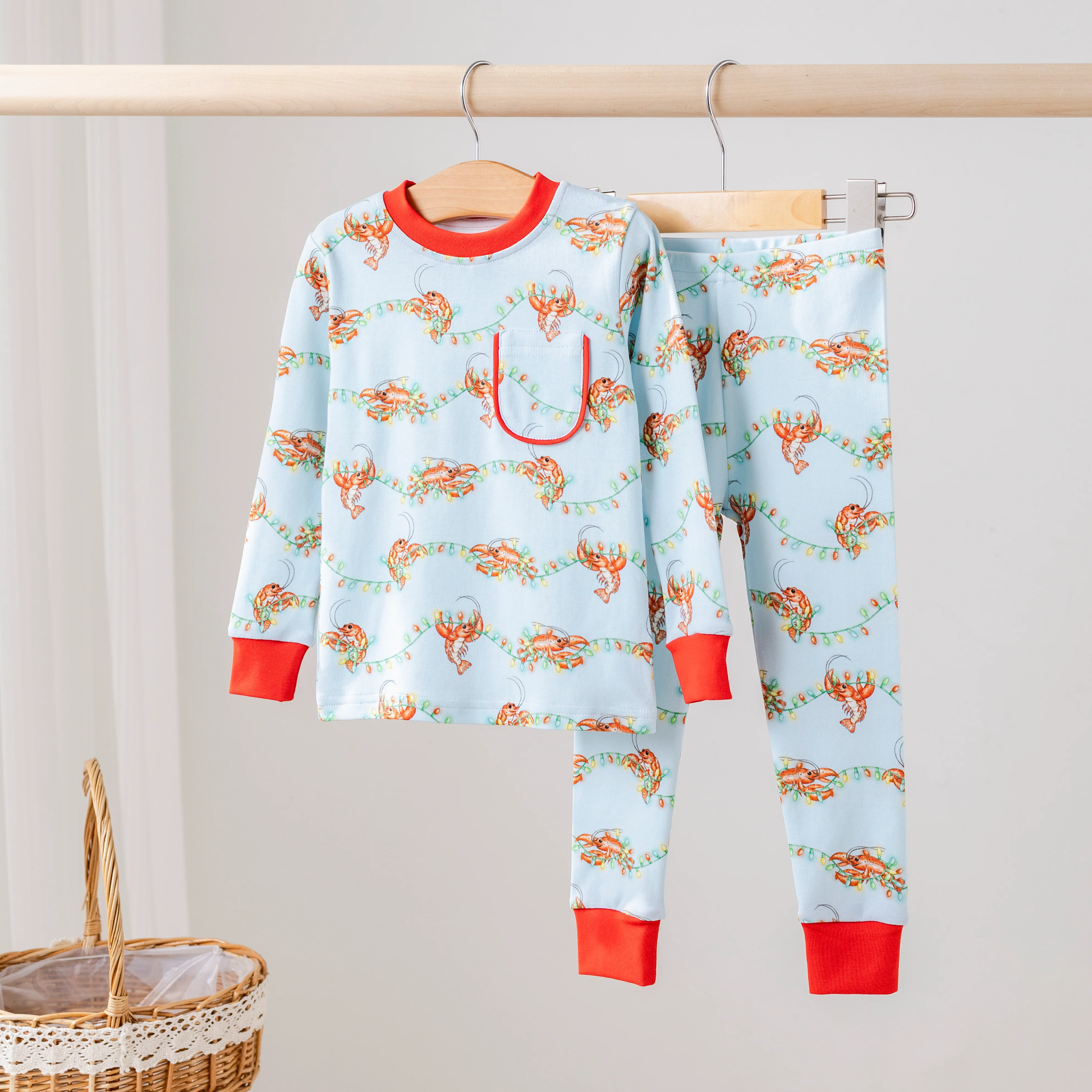 Light up bedtime with the Twinkling Tails Organic Cotton Kids Pajamas! Featuring a festive holiday print of playful crawfish tangled in colorful Christmas lights, these cozy, breathable pajamas are perfect for little ones who love a touch of Louisiana charm in their holiday celebrations. Designed for comfort and all-night rest, these ultra-soft, GOTS-certified organic cotton pajamas will keep your child snug and full of holiday cheer from bedtime to Christmas morning.