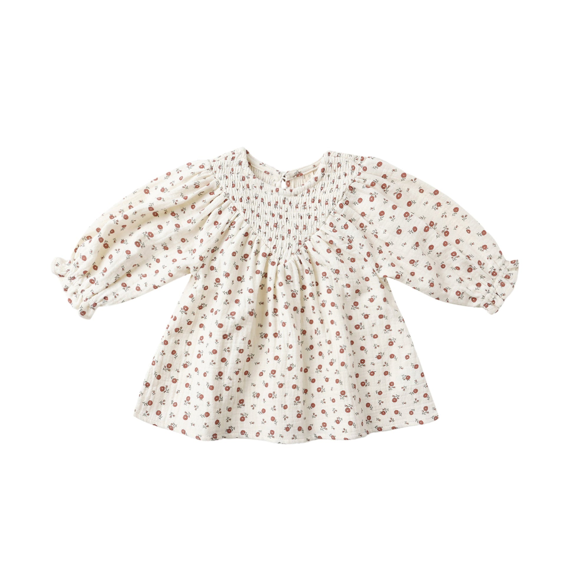 This sweet long sleeve dress features a v-shaped smocked neckline, ruffle sleeves, and a button back closure for easy changes. Coordinating bloomers included with all sizes.