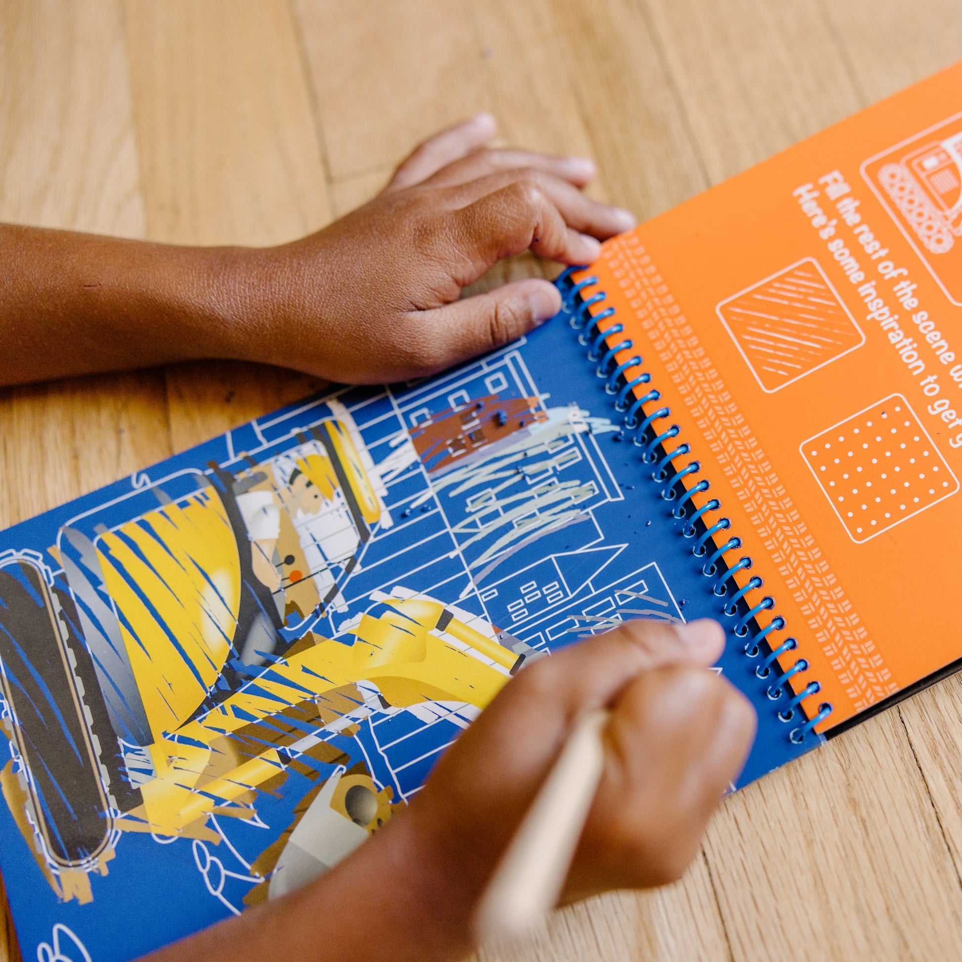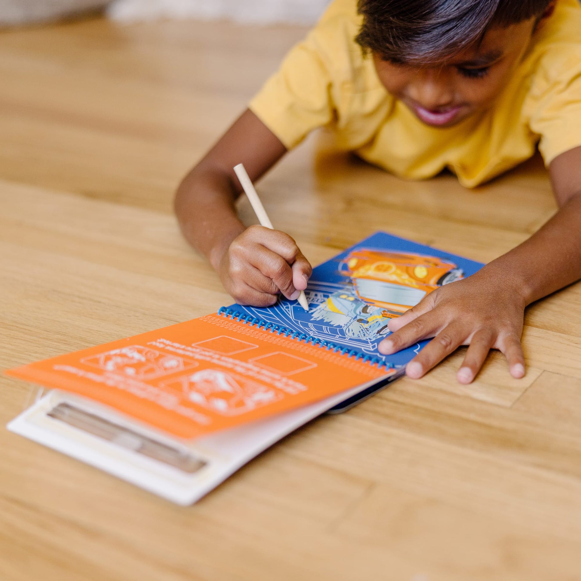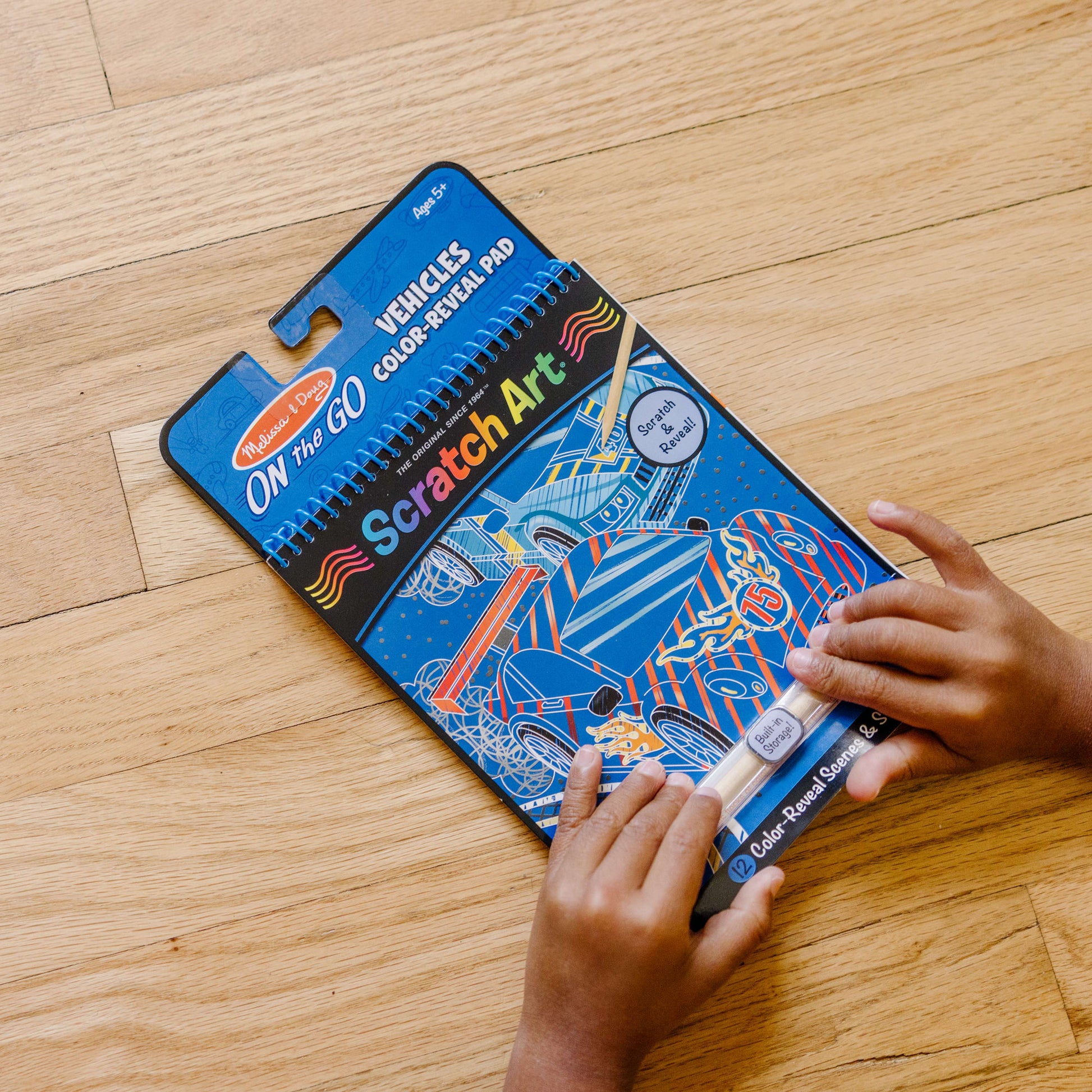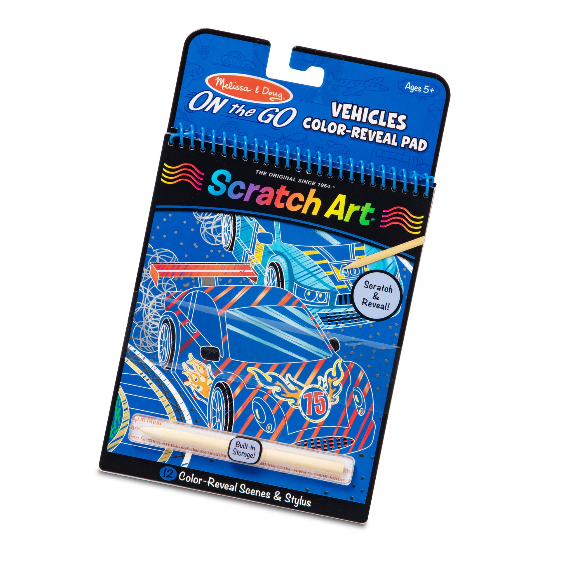All-inclusive and self-storing, this compact color-reveal Scratch Art book brings the fun anywhere kids may go. With the included wooden stylus, children can etch within the lines to reveal 12 vehicle scenes featuring cars, trucks, trains, and more; by adding patterns and details, they can make each picture uniquely their own! Each set comes with built-in storage for the included stylus.