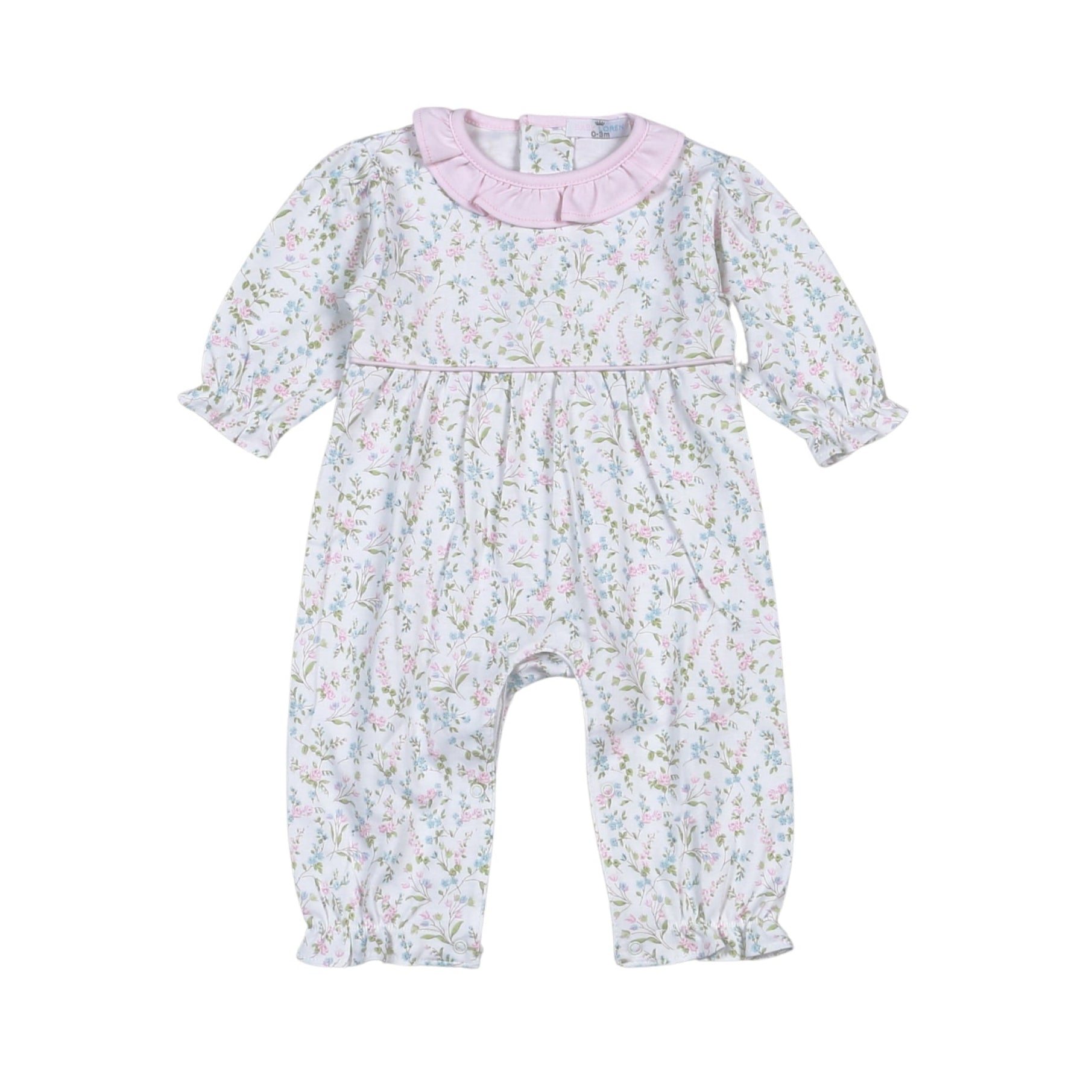 The Vivian Floral Hand Smocked Bishop Footie by Baby Loren is a graceful blend of comfort and charm, designed for the tiniest trendsetters. This long-sleeved one-piece features a delicate floral print in soft pastel tones—petal pinks, sky blues, and leafy greens scattered across a crisp white canvas. A light pink Peter Pan collar frames the neckline with classic sweetness, while hand-smocked detailing across the chest adds heirloom-worthy craftsmanship. The gentle bishop sleeves and elasticized cuffs offer a cozy fit, and a dainty bow at the collar completes the look with a whisper of whimsy. Whether for a first outing or a cozy day at home, this footie is a picture of timeless baby elegance.