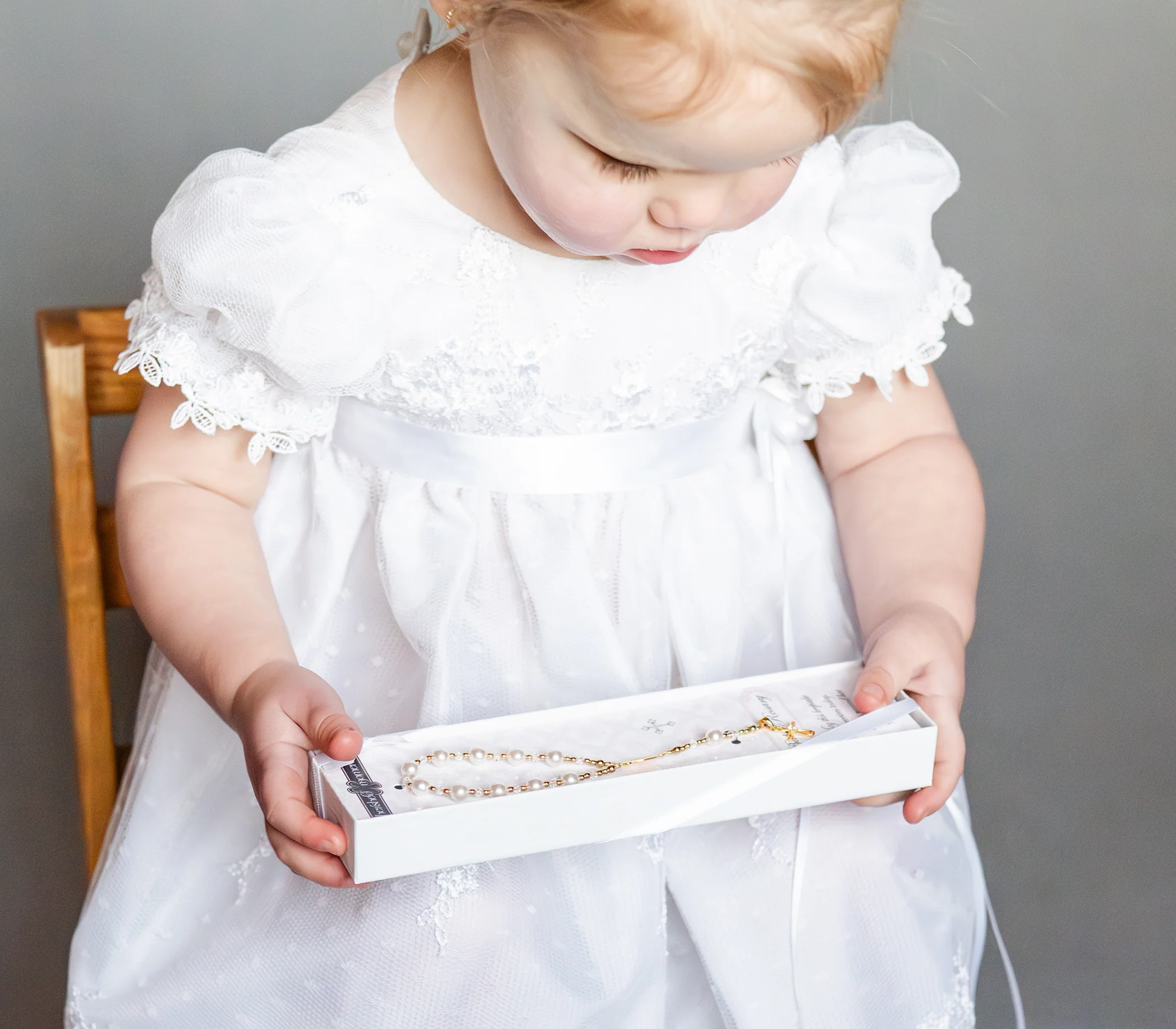 This precious white baby rosary makes a special baptism keepsake designed with 14k gold-plating over sterling silver and designed with exquisite white high-end Austrian simulated pearls and crystals. This features a miraculous medal and cross charm and is packaged as a special keepsake ready for gifting. Celebrate these cherished moments with this keepsake she will treasure forever!