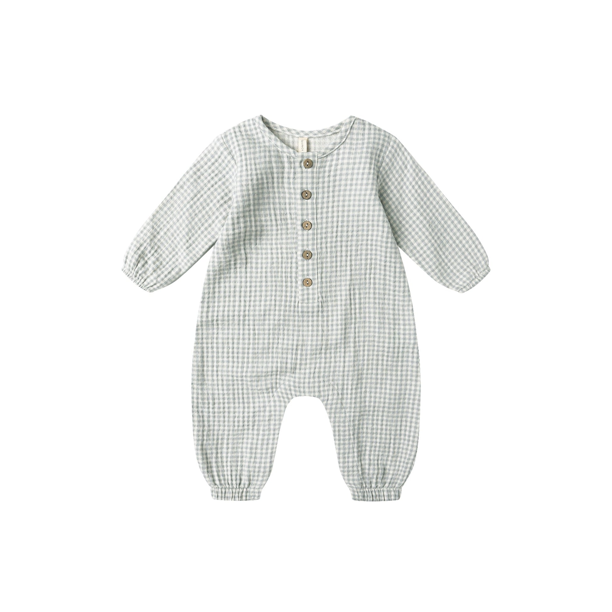 Long sleeve jumpsuit crafted from soft organic cotton gauze, featuring coconut buttons down the chest, hidden snaps along the inseam for easy changing, and elastic at the sleeve and leg openings for a perfect fit.