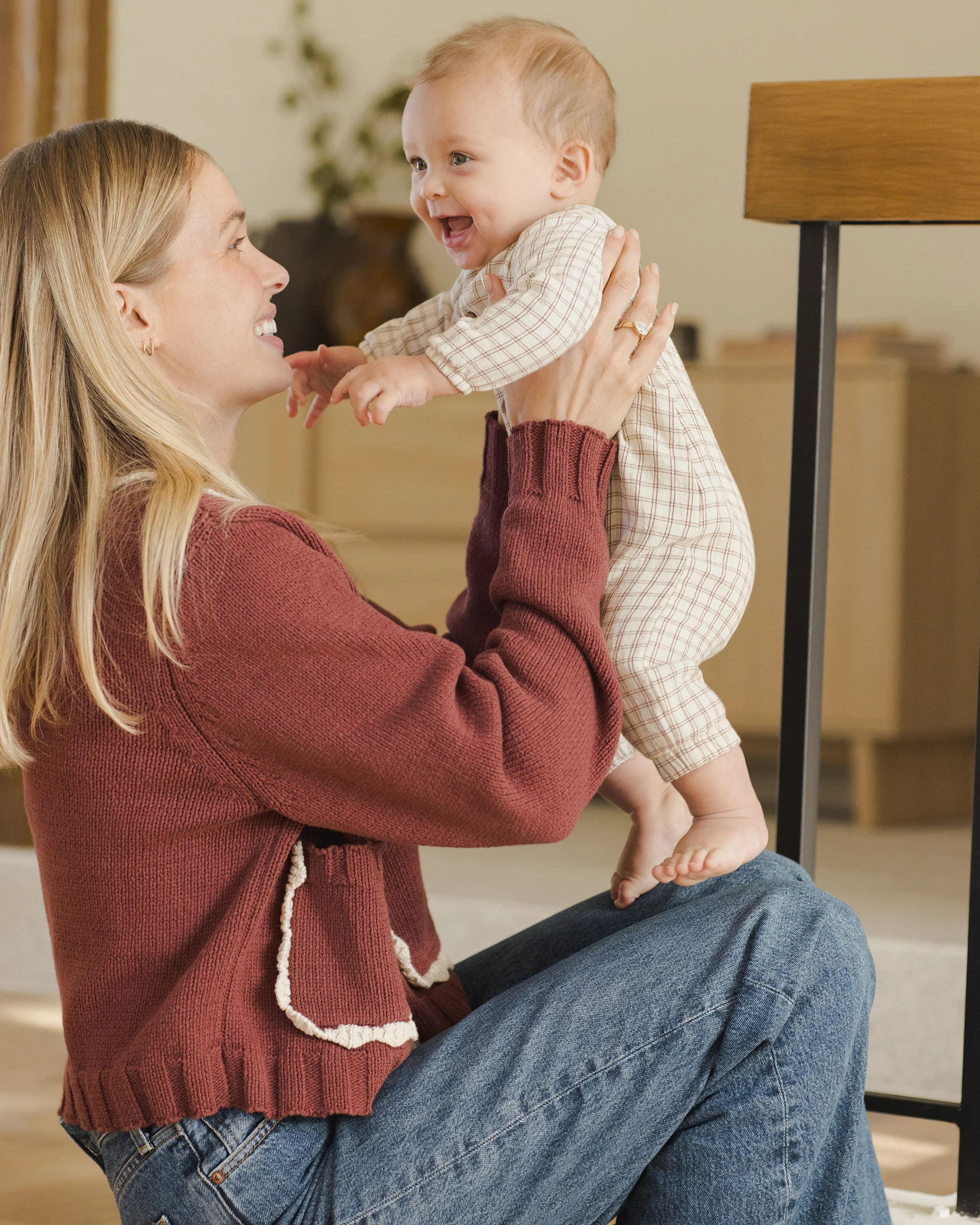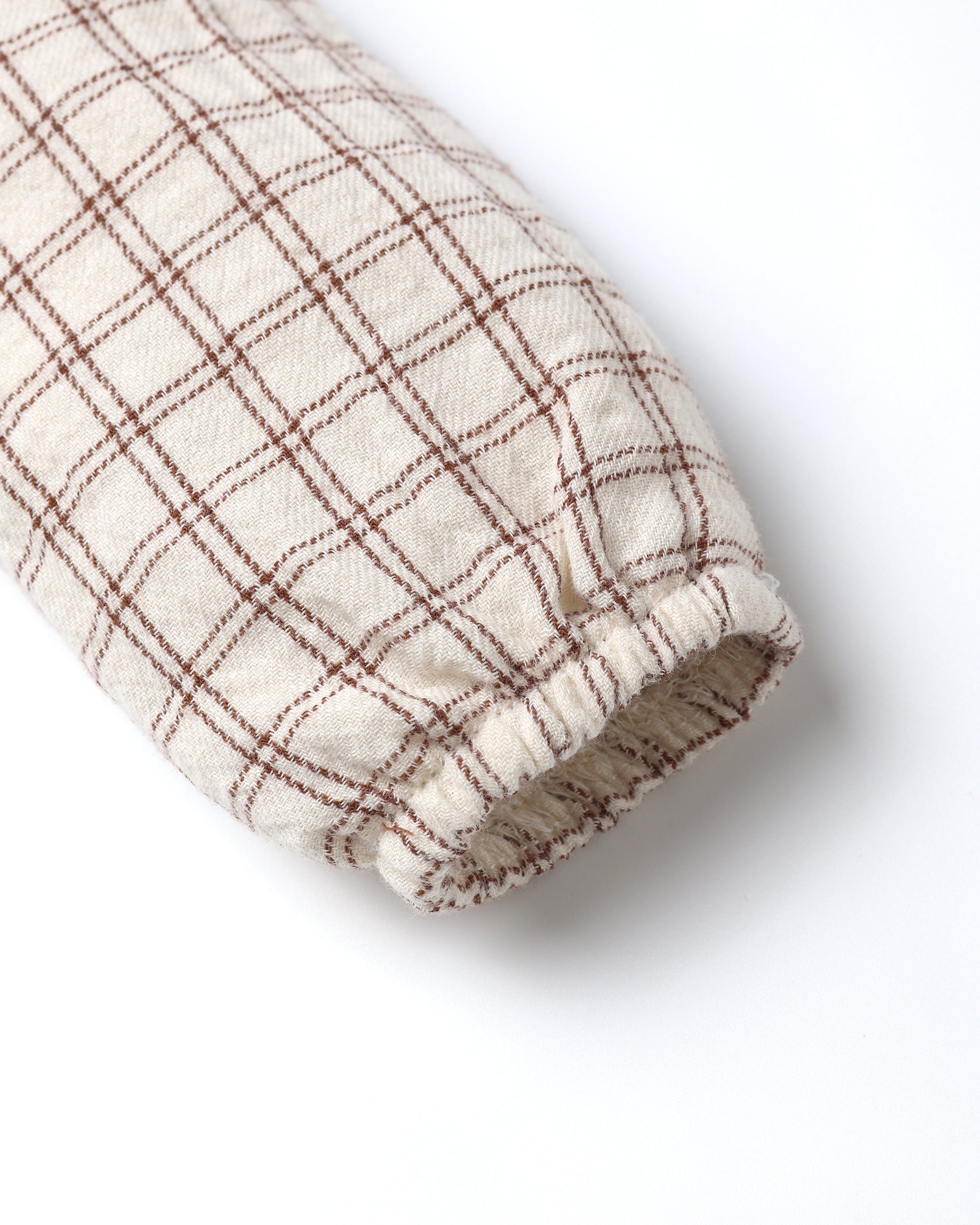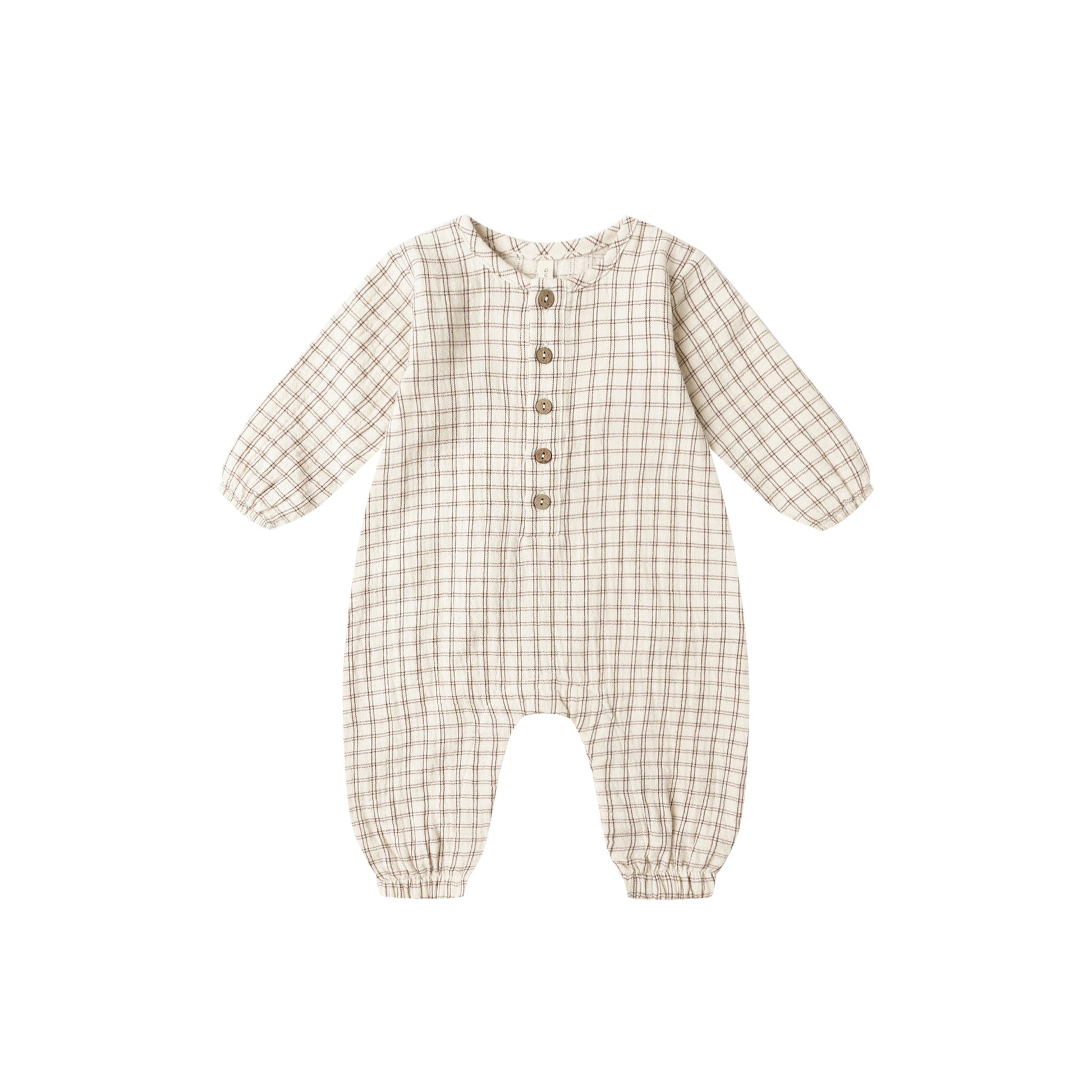 Long sleeve jumpsuit crafted from soft organic cotton gauze, featuring coconut buttons down the chest, hidden snaps along the inseam for easy changing, and elastic at the sleeve and leg openings for a perfect fit.