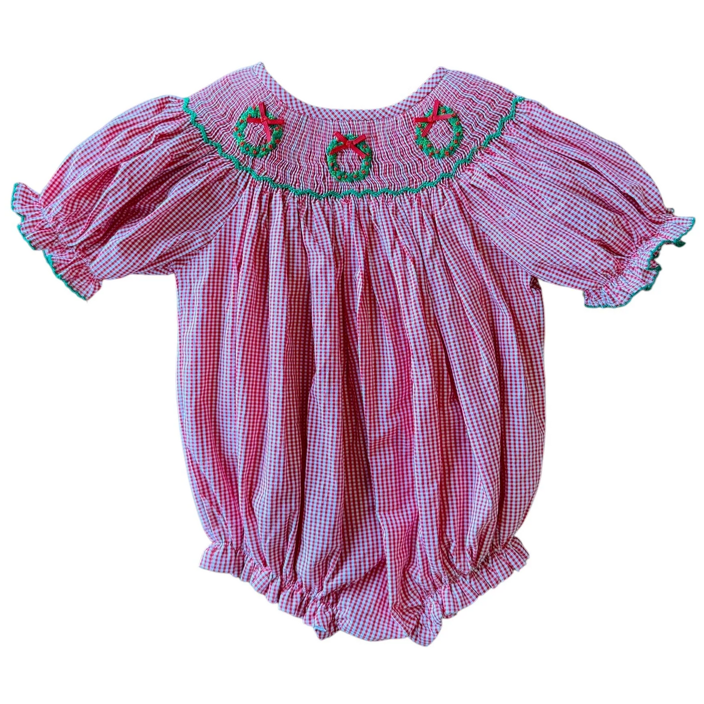 This adorable bubble features red gingham cotton with hand-smocked wreaths across the chest. A crisp white Peter Pan collar and gathered leg openings add timeless charm for holiday celebrations.
