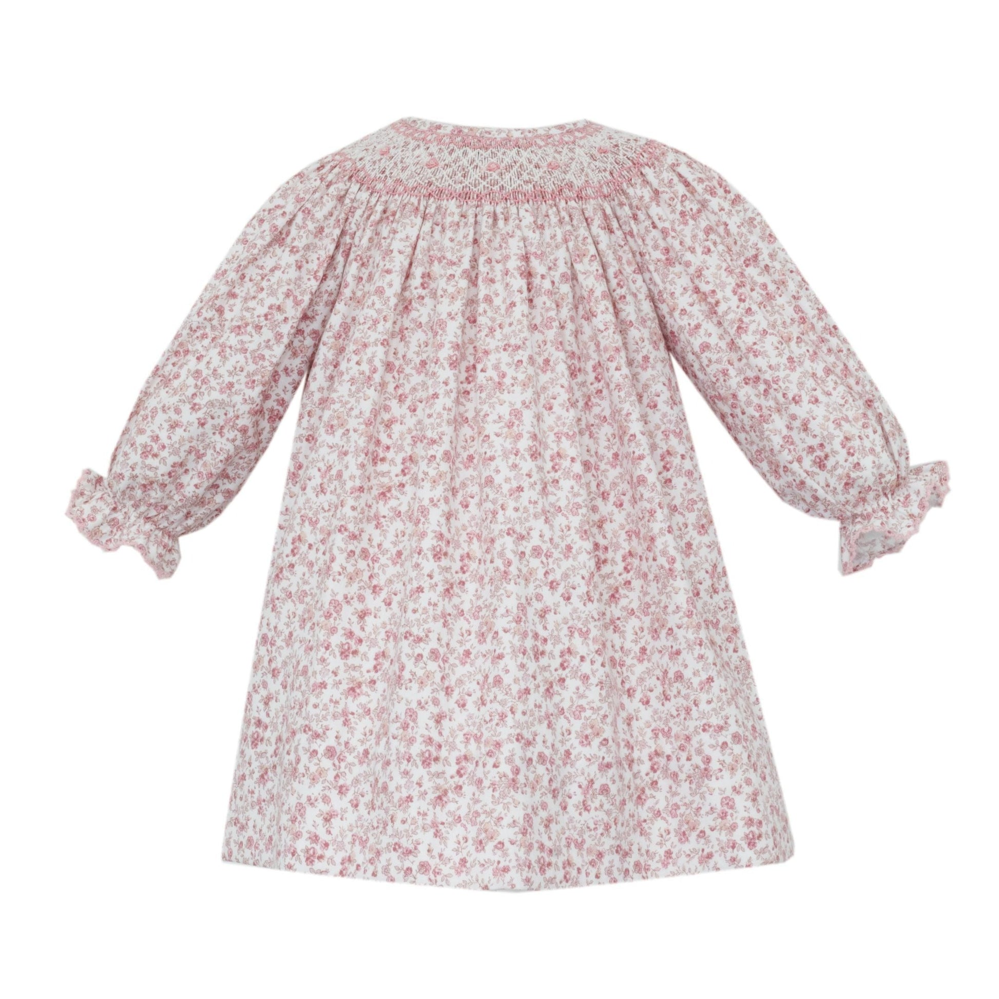This Anavini bishop dress is the picture of delicate grace, with soft florals and timeless smocking that make it a standout piece for any little one’s wardrobe. Crafted in a white fabric scattered with tiny pink roses, this long-sleeved dress blends tradition and charm. The smocked neckline is intricately embroidered in coordinating tones, while gentle ruffle cuffs add a refined finish.