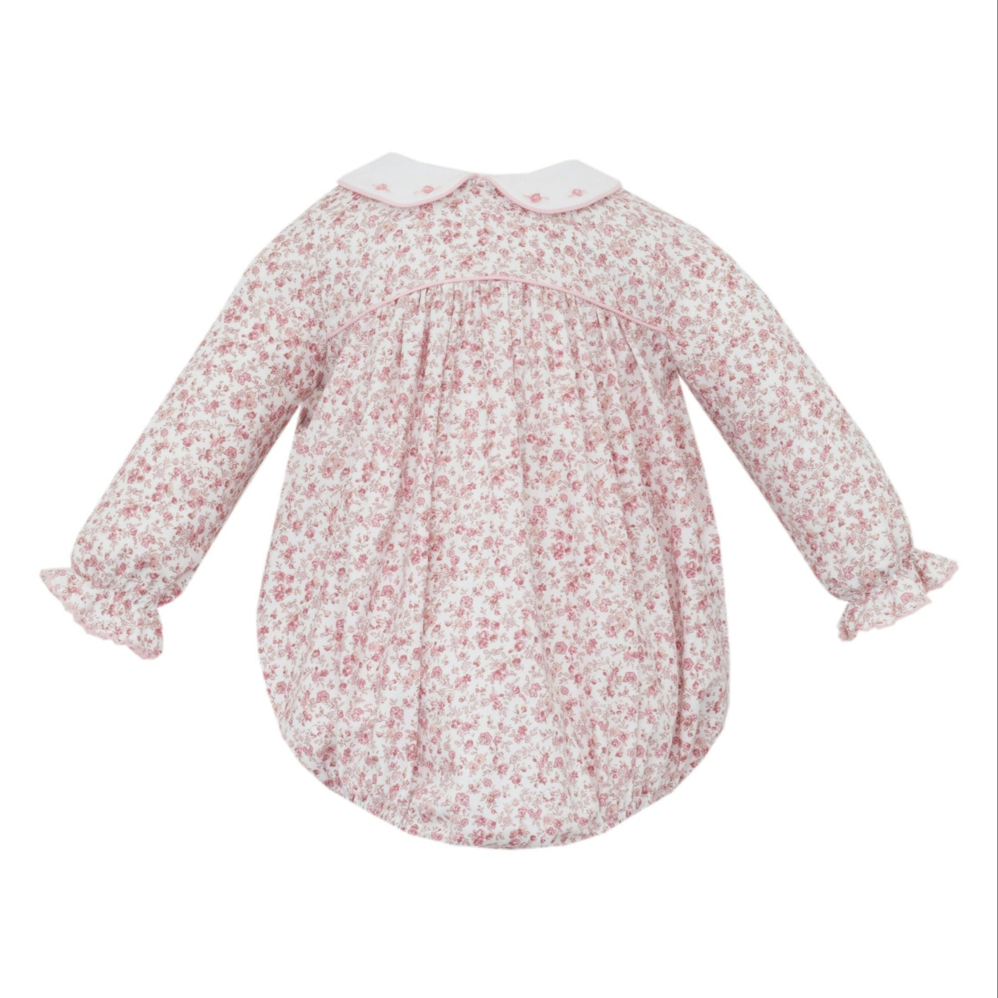 This bubble from Anavini blends soft charm with classic craftsmanship, creating a darling look that pairs perfectly with the coordinating bishop dress. Crafted in the same floral print, this bubble features a smocked chest embroidered with delicate pink rose accents, framed by a white collar edged in pink picot trim. Sweet ruffle sleeves and gentle gathers add volume and vintage appeal—making it a timeless addition to her wardrobe.